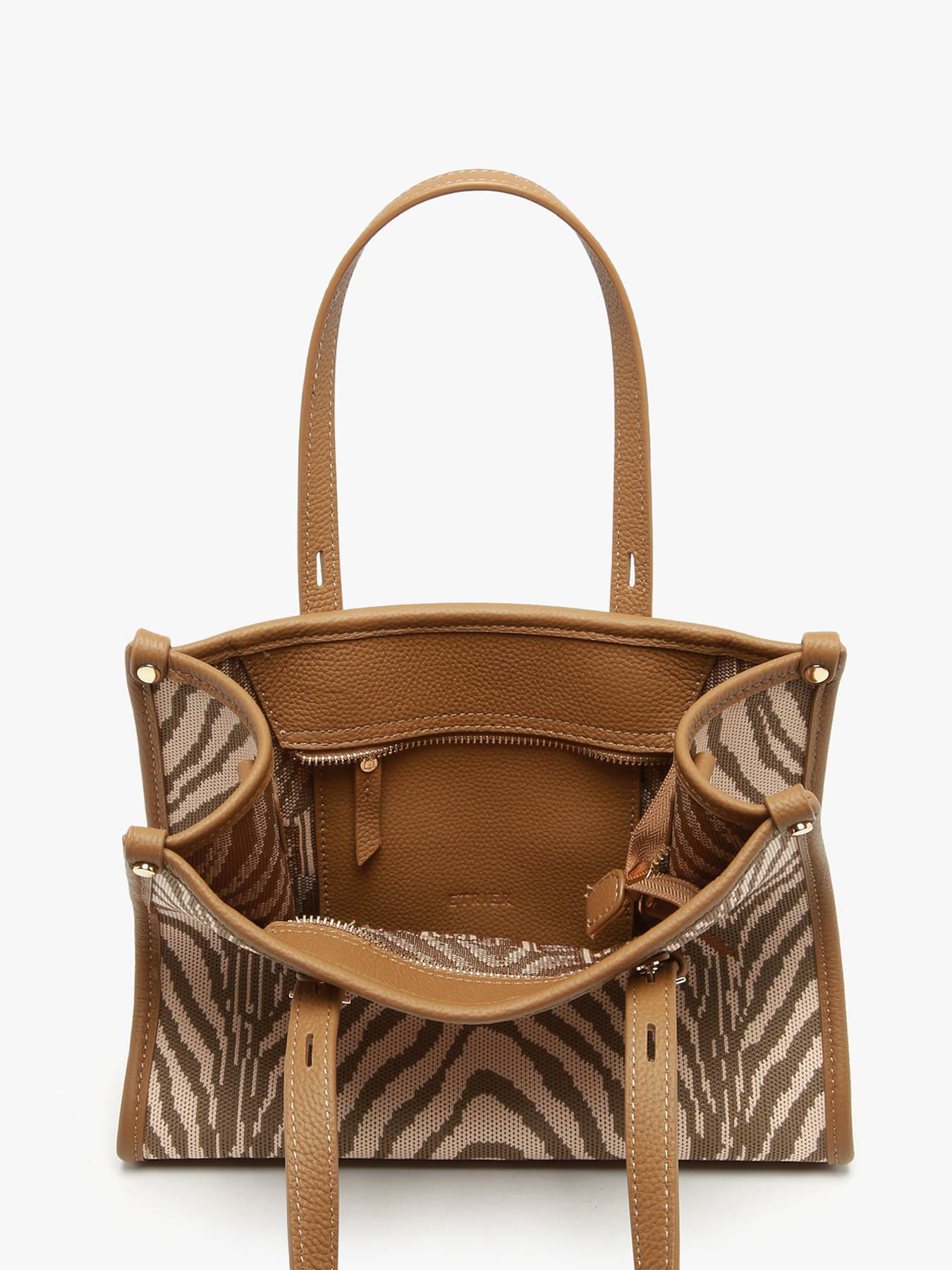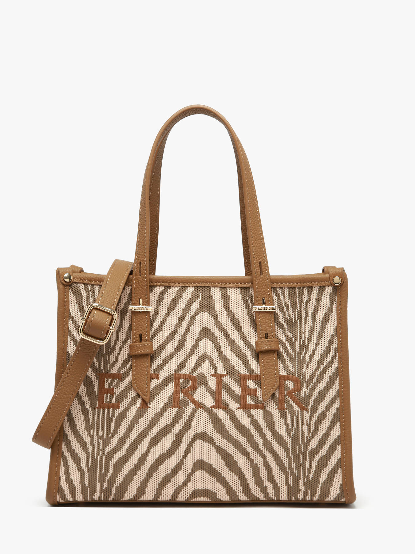 The SAFARI mini tote / crossbody bag by ETRIER brings the bold spirit of the collection into a compact and fashion-forward design. Crafted from textile with leather trim, it stands out with graphic animal prints that create a strong, modern look. Practical and lightweight, this size S model can be carried by hand using its 16 cm handles or worn crossbody with its adjustable and removable strap, adapting to every style. Its zip closure keeps your essentials secure, while an interior zippered pocket provides organized storage. A stylish and functional mini tote, perfect for adding character and elegance to your summer days.