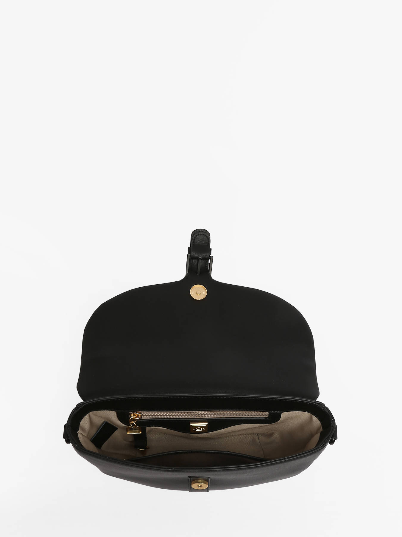 La nouvelle version du sac bandoulière ETRIER de la ligne OXER, au format demi-lune, se pare d'accessoires ton sur ton. Confectionné en cuir de vachette, il dispose d'une poche au dos et se ferme par un rabat et pression aimantée. La bandoulière réglable et amovible en cuir offre une option de porté court en travers. L'intérieur spacieux comprend un compartiment avec une poche plaquée et une poche zippée pour une organisation optimale.