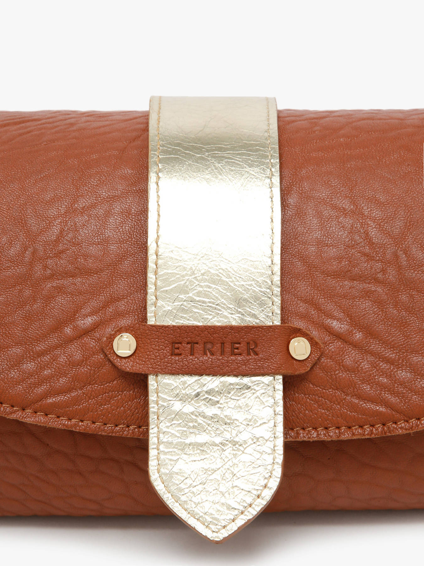 The AGNES crossbody bag by ETRIER is crafted from French crinkled lambskin leather. This model is shown here in size M and features a flap closure secured with a magnetic snap button. It is also available in size S for those who prefer a more generous capacity.